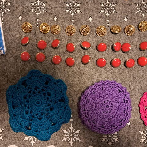 Monipuolinen kokoelma ompelutarvikkeita ja kangaspaloja eri väreissä ja materiaaleissa. Sisältää useita kangaspaloja eri kuoseilla ja väreillä, erilaisia nappeja ja ompelutarvikkeita kuten sakset, nauhoja.Sopii erilaisten vaate- ja käsityöprojektien toteuttamiseen.