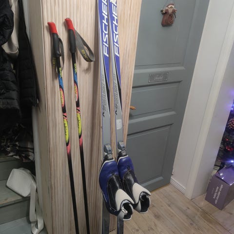Sukset 117cm , sauvat 95cm, siteet ja monot 31