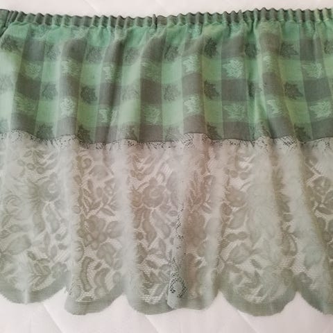 Pitsireunuksellinen siniruudullinen ehjä kappaverho koko 40x268 cm.