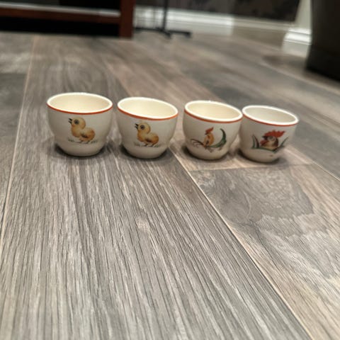 Munakuppi jossa ylä ja alareunassa turkoosit raidat on luultavasti Arabian koti sarjan munakuppi joka on erittäin hyvässä kunnossa
