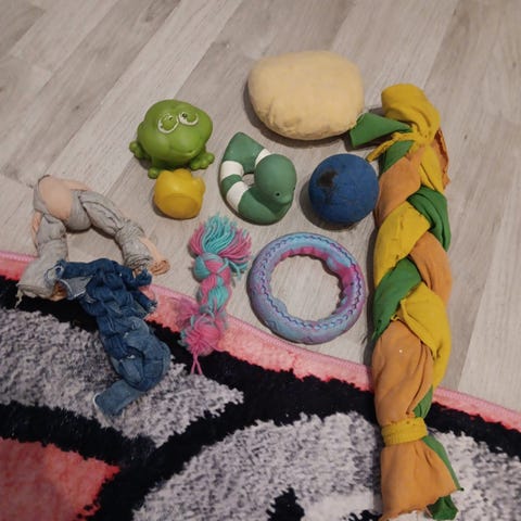 Sekalaisia koiranleluja, jotain käytetty. Myös koiranluu