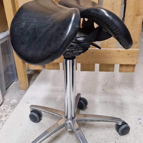 Satulatuoli mustalla keinonahkapäällysteellä, jossa portaattomasti säädettävä istuinkorkeus kaasujousella. Tuolissa on metallinen viisipistejalusta ja pyörät, jotka mahdollistavat helpon liikkumisen. Soveltuu työpisteille, joissa tarvitaan ergonomista istumaratkaisua. Käytön kuluttama, mutta ehjä istuinosa. Nouto Helsingin Kalliosta.