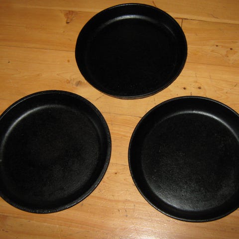 Neljä valurautaista blinipannua, Pohjan halkaisija, 12 cm, 13 cm ja 9 cm
