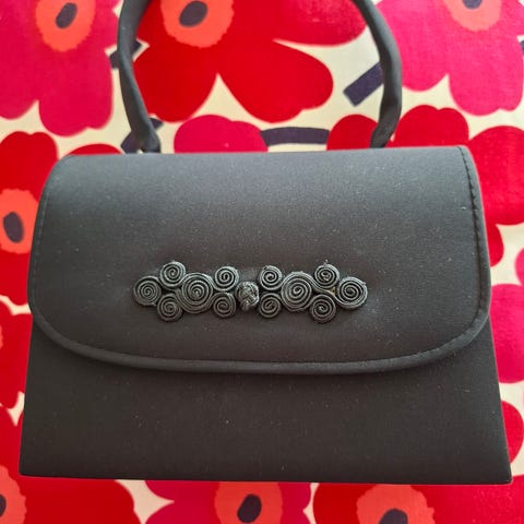 Musta iltalaukku, jossa kolme taskua + yksi vetoketjullinen tasku. Laukussa olkahihna. Materiaalista ei varmuutta, kenties nahkaa.