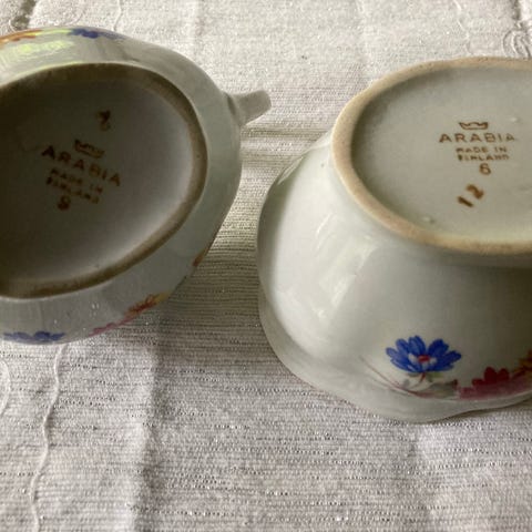 kermakko ja sokerikko. Leimoja ei löydy mutta tekoäly väittää Arabiaksi. Minulle periytyneet, joten en tiedä taustoja.