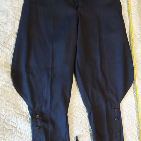 Vanhat, paksua sarkaa olevat siistit pussihousut. Kangas ehjä, taskut ehjät, napit paikoillaan. Jalan alle laitettavat kuminauhat ovat venyneet.