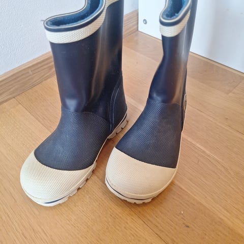 Viking lämminvuoriset kumpparit. Materiaali kulunut varren aukon ympäriltä, muuten kunto hyvä. Sisämitta 17 cm.