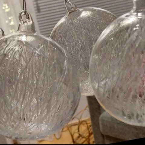 Joulukuusen koristeet. Lasipallot ehjät, pakkaus hieman kärsineet. Valkoinen / harmaa / lasi.