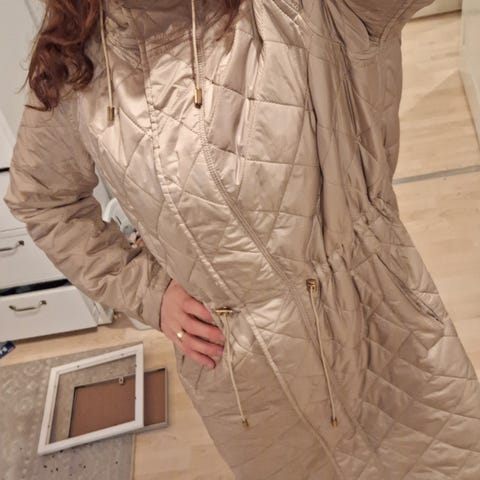 Zara Basic tummansininen naisten puolipitkä tikkitakki. Koko M. Takissa huppu. Materiaali on kevyt ja sopii erilaisiin ulkoilutilanteisiin.