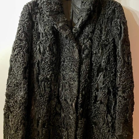 Musta lyhyt krimiturkki. Hyväkuntoinen, mutta vanha. Kokonumeroa ei oli, mutta arvio 40. Kotimaisen Pohjanmaan turkiksen tekemä.