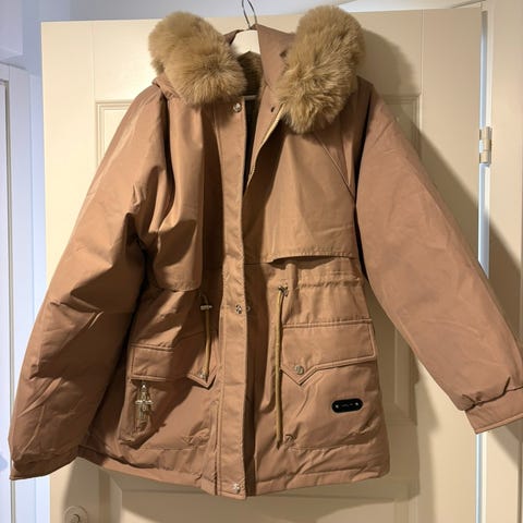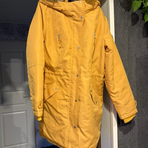 Pinta vettä hylkivää materiaalia ja paksu lämmin vuori. Ostettu Bik Bokista. Koko L.