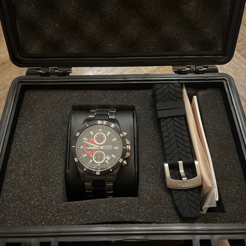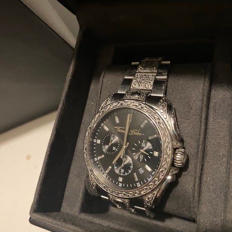Priimakuntoinen kvarts koneistolla, varustettu rock henkinen rannekello. Oma alkuperäinen boksi mukaan.