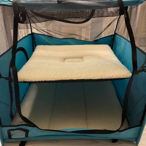 Otsikon mukainen näyttely häkki, jossa on verkkopaneelit ilmanvaihtoa varten. Soveltuu lemmikkieläinten kuljetukseen tai tilapäiseksi lepopaikaksi. Vetoketjulla varustetut taskut. Materiaalina kestävä kangas, koko noin 53×57×63 cm.