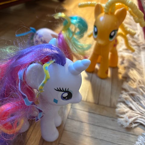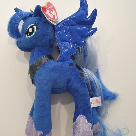 Iso pehmolelu, siisti kunto kaikinpuolin, laput paikallaan. Harja ja häntä hieman karheita kuten kuvista näkee, kampa menee läpi kuitenkin.