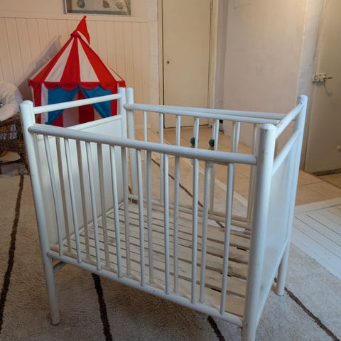 Kaunis, nostalginen pinnasänky laskettavalla sivulla. Pinnasängyn pohjan korkeutta voi säätää. Pohjavaneri uusittu juuri, ja siinä on reikiä patjan tuulettamisen tehostamiseksi. Pieniä kulumajälkiä toki löytyy mutta päällisin puolin sänky on hyvässä maalissa.