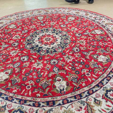 Upea käsin solmittu villa- ja silkkimatto. Upea persialainen nain-matto. Todella upea matto. Nain-matoissa on tyypillisesti sekoitus puuvillahapsuja sekä kudottua villaa ja silkkiä. Nain-matoissa käytetään tyypillisesti hillittyjä värejä, ja päävärit ovat tyypillisesti beige. Ne ovat yksi tunnetuimmista ja suosituimmista persialaisista mattotyyleistä maailmanlaajuisilla markkinoilla. Nämä matot ovat vaikuttavia kestävyytensä, kudontalaatunsa ja visuaalisen vetovoimansa ansiosta. Pyöreitä mattoja on paljon vaikeampi solmia, minkä vuoksi niitä on markkinoilla vain muutama. Tämä matto on myös melko suuri. Sen halkaisija on 228 cm, mikä tekee siitä paljon suuremman kuin useimmat pyöreät matot. Se on todella ainutlaatuinen matto.Pyöreitä mattoja on paljon vaikeampi solmia, minkä vuoksi niitä on markkinoilla vain muutama. Tämä matto on myös melko suuri. Sen halkaisija on 228 cm, mikä tekee siitä paljon suuremman kuin useimmat pyöreät matot. Se on todella ainutlaatuinen matto.