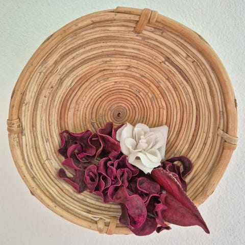 Rottinki sydänkoriste, jossa valkoinen nauha. Soveltuu sisustukseen eri vuodenaikoina.