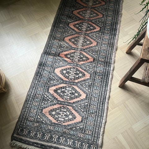Matto on googlauksien mukaan valmistettu Belgiassa ja se on 100 % viskoosia. Se on mukavan silkkisen tuntuinen jalan alla ja kohtuullisen hyväkuntoinen, sen reunassa on vähän pientä kulumajälkeä. Se on mielyttävän kevyt myös käsitellä ja puhdas (yhä pesulan pussissa.)