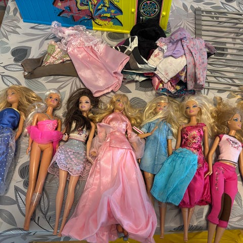 Barbie lastenlelut,Barbie 1kpl nukenvaatteet eri malleja ja värejä, sisältäen vaaleanpunaisen yöpukutyylisen asun sekä valko-punaisen pilkullisen hameen. Soveltuu Barbie-nukeille.