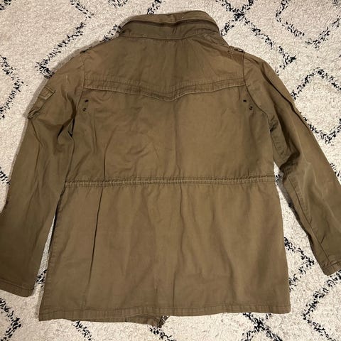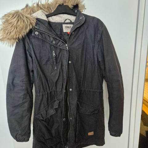 Beigen värinen, mukava päällä. Karvavuori muuten paitsi hihoissa. Hieman takin helmaan tarttunut tummaa mustista farkuista/housuista, ei ole kokeiltu pestä, osa lähtee varmasti myös tarraharjalla.