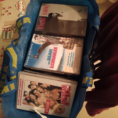 Kaikki 2x elokuvahyllyä ja elokuvat paketissa. Hyllyjen korkeus n. 200cm luokkaa, leveys 40cm syvyys 20cm.