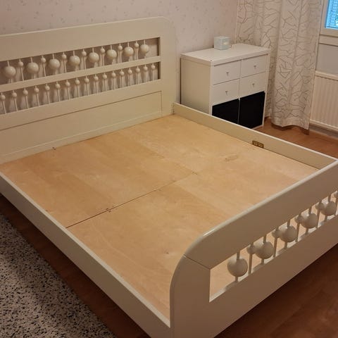 Noin 1,5 vuotta käytössä ollut uutena Ikeasta ostettu Hemnes sängynrunko. Oikein hyvässä kunnossa oleva tukeva sänky, valmistettu massiivipuusta. Mukaan sälepohjat, keskipalkki ja 2x4 lankut jotka ovat olleet jämäköittämässä sälepohjia.