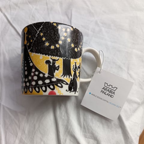 Myynnissä tuotannosta poistunut Arabian muumimuki Hurraa. Muki on uusi. Lappu on paikoillaan. Tarraa ei näissä mukeissa ole koskaan ollutkaan.