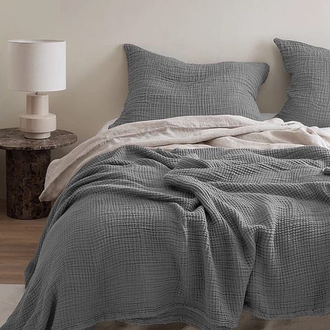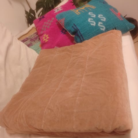 Vähän käytöllä ollut päiväpeite. Koko 180x260cm. Väri Vaalea beige. Materiaali 100% polyesteriä.