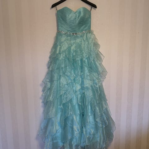 Ilta- tai juhlapuku, koko 38, burgundinpunainen väri. Puku on pitkä ja siinä on koristeltu yläosa helmillä ja paljeteilla. Takana on nyöritys, joka mahdollistaa säädön istuvuuden parantamiseksi.