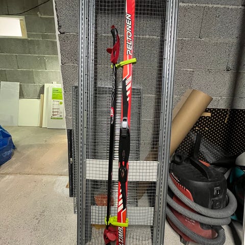 Sukset 130 cm+sauvat 95cm. Monot koko 34. Sukset puhdistusta ja mahdollisesti huoltoa vaille. Myynnissä muuallakin.