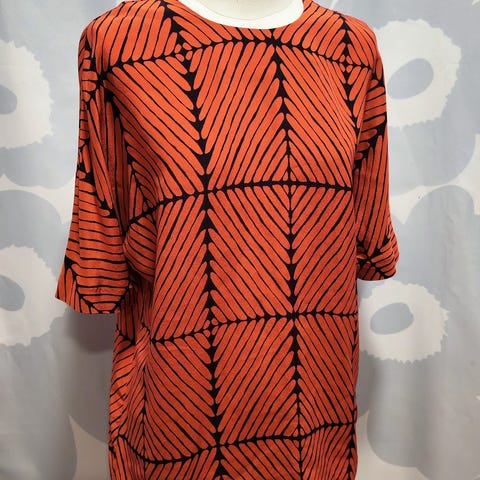 Marimekon kaunis katrelli acapulco pusero. Miellyttävää 100% viskoosia. Lyhyet hihat, ei olkasaumaa, kaunis v-aukko selässä. Koko 38. Kai-kai 50cm, olka-helma 61cm. Edestä ylhäältä korjattu reikä ja laput leikattu kahtia. Muuten kunnossa ei moitetta.