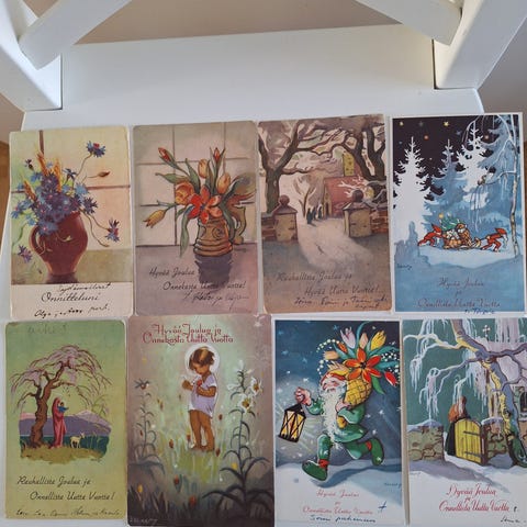 Vanhoja Martta Wendelin kortteja joissa osassa ajan patinaa.