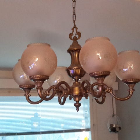 Upea valaisin, valmistettu noin 20 vuotta sitten. Metallirunko, kahta eri väriä, viisi maitolasista valaisinpistettä. Valaisee hyvin. Korkeus säädettävissä, nyt noin 60 cm, halkaisija myös noin 60 cm. Ei vaurioita tai puutteita. Ei myöskään mielestäni käytön jälkiä, eikä patinaa.