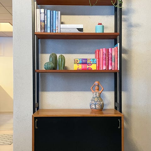 Todella siistissä kunnossa oleva kolmiosainen kirjahyllykokonaisuus baari- ja lasiovisilla elementeillä. Vain haku, hissitalo.