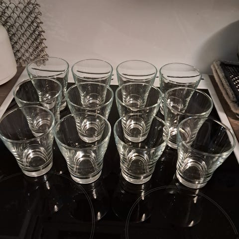 Juomalasit, kolme käyttämätöntä, kolmea käytetty. Lasit täysin virheettömät. Ei ole pesty koneessa, taloudessa ei ollut silloin pesukonetta. Paksupohjaiset.