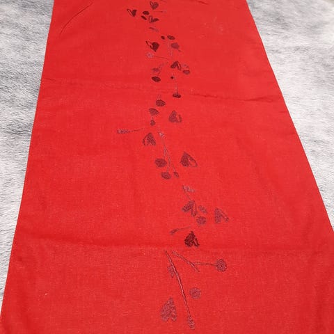 Kaitaliina jossa punaisella pohjalla joulukuusia ja tähtiä. Puuvillaa