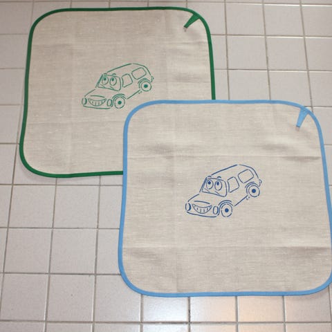 Uusi pellavasta ommeltu laudeliina/pefletti n.45x45cm, johon käsinpainettu traktori kuva.