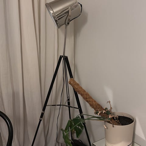 Himmennys säädettävissä, sisältää myös lukuvalon, lukuvalosta puuttuu poltin. Korkeus 180cm
