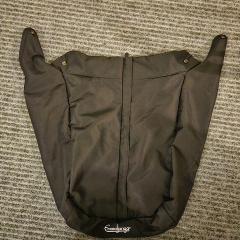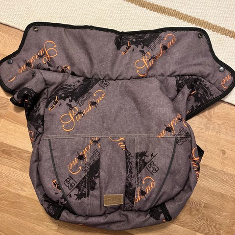 Hyvässä kunnossa ja pestynä. Peitteessä ei lue suoraan, mihin ratasmalliin se sopii, mutta meillä sen sai jotenkin kiinni double viking rattaisiin.