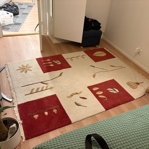 Myydään villamatto, jossa käänteiset värit kummallakin puolella. Harmaa ja valkoinen kuviointi. Nouto Katajanokalta.