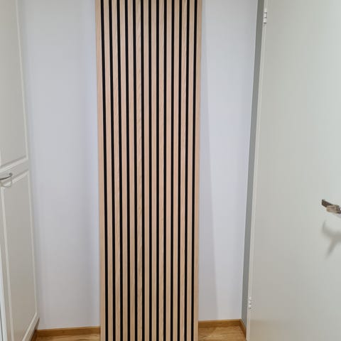 Akustinen katto ja seinälevy. Kipsilevy viistereunalla, pyöreä reikä.
