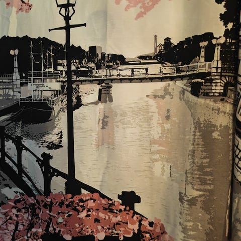 Upea turkoosinsininen Vallilan Lumi-verho. Valmisverho, jossa tankokuja ja kiristysnauhat.