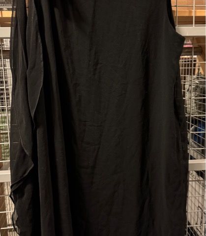 Pääliosa väljä ja epäsymmetristi leikattu, 100% polyesteriä. Oikealla puolella siipimäiiseksi leikattu, laskeutuva yksityiskohta.