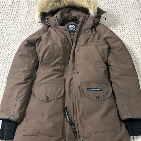 Canada Goose, punainen koossa L. Takissa näkyy käytön jälkiä ja kulumia erityisesti taskuissa. Kaipailee myös pesua. Toinen ns. kantohihna takin sisältä katkennut. Karva irroitettavissa (vetoketju).