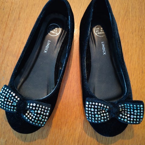 Tyttöjen juhlakengät, koko 30. Mustat kengät, joissa koristeena rusettikuviointi. Olleet käytössä ainoastaan yksissä juhlissa sisätiloissa.
