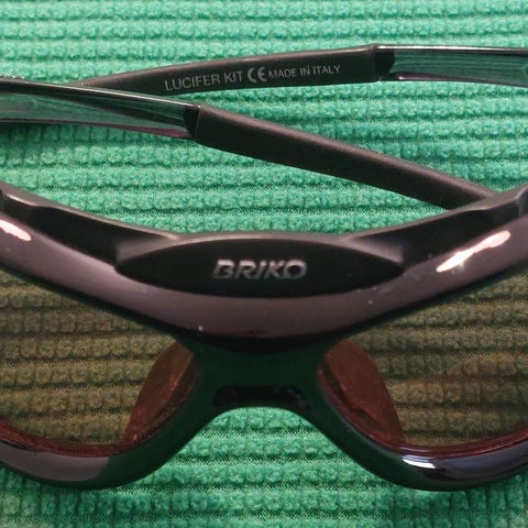 Brikon urheilulasit, joissa on kullan väriset linssit sekä säädettävä pääpanta. Kehys on väriltään myös kullan värinen ja materiaali kestävää. Lasit soveltuvat ulkoiluun ja urheilukäyttöön, tarjoten suojaa auringonvalolta ja viimalta.