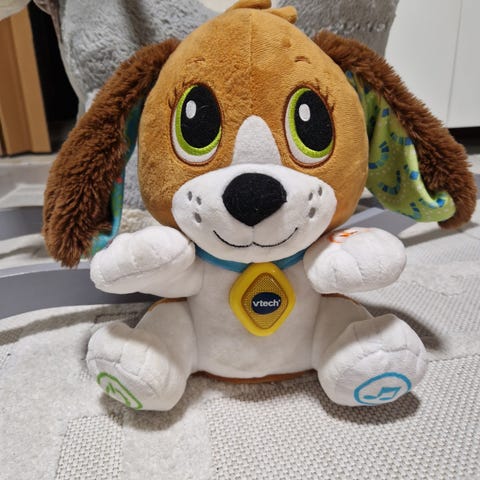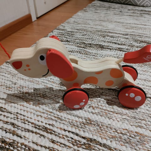 Värikäs puinen vetolelu, joka liikkuu kevyesti lapsen mukana. Suloisen koiranpennun häntä heiluu, kun sitä vetää perässä. Paikalla ollessaan koira nuuskii pää alhaalla ja narusta vetäessä se nostaa reippaasti päätään.
