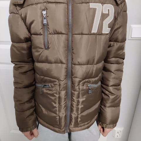 Takissa on sininen ja vihreä väritys, vetoketjulla varustettu etuosan sulkemiseen ja hupullinen malli. Valmistettu materiaalista, joka sopii kylmiin olosuhteisiin.
