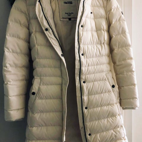 Tommy Hilfiger talvitakki naisille, koko XS. Takki on valkoinen ja siinä on harmaat neulottu kaulus ja hihansuut. Hyvin vähäisellä käytöllä ollut, joten kunto uudenveroinen.