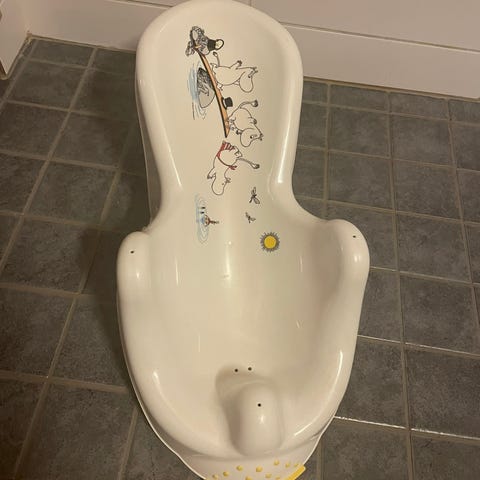 "Muumi-aiheinen lasten kylpytuki. Käytännöllinen apu kylvettämiseen. Kumitassut ja imukuppi pitävät tuen paikallaan."